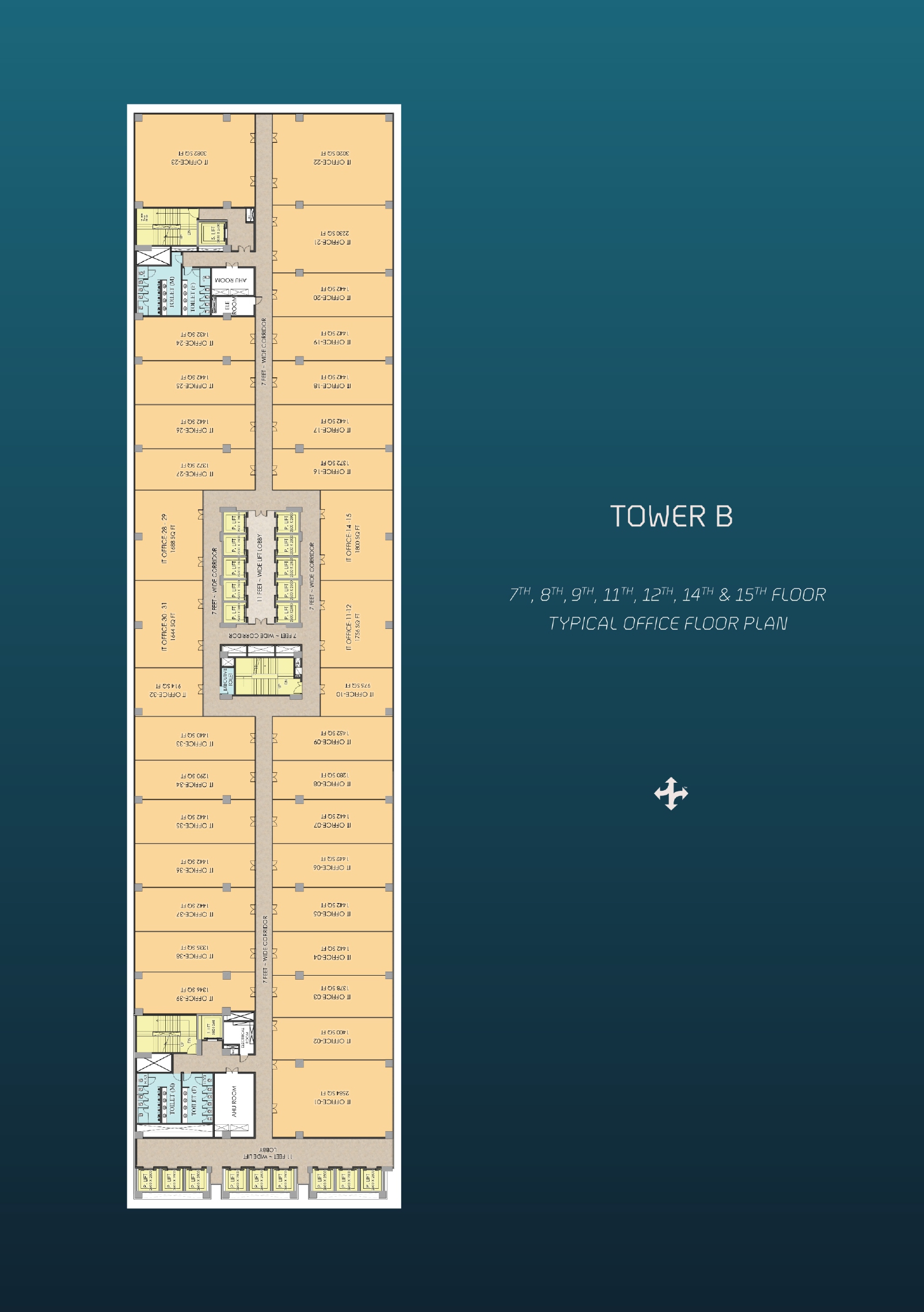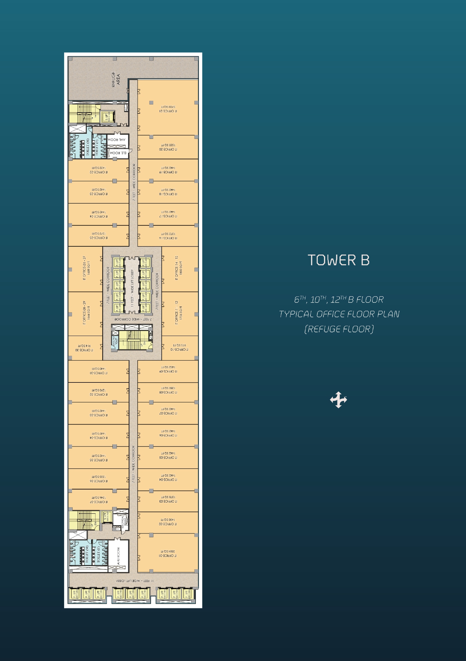 - Tower B rises elegantly to 15 floors, featuring an expansive floor plate of approx. 53,000 square feet – one of the Noida’s largest. Setting a remarkable standard, it offers businesses a vast canvas for versatile office configurations.
